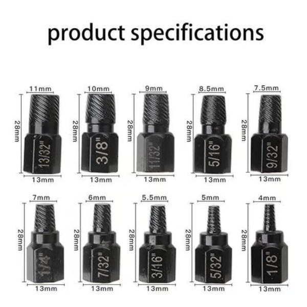 De 10-delige boutenverwijderingsset biedt een uitgebreid assortiment maten, zodat je altijd het juiste gereedschap hebt voor elke verwijderingstaak.