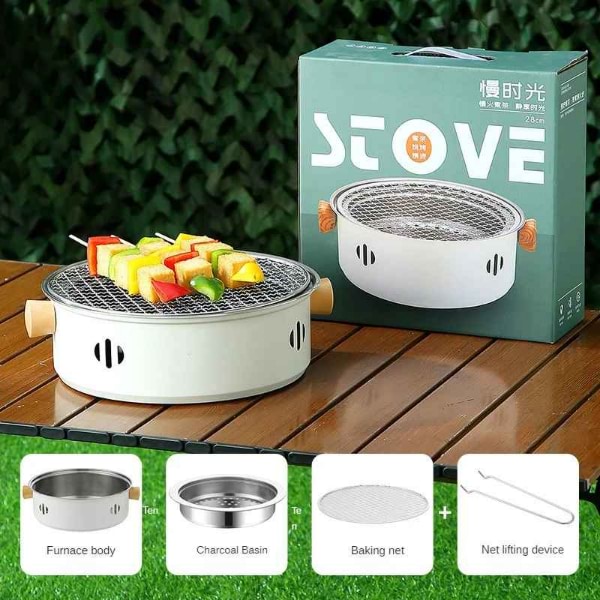 De draagbare houtskoolgrill heeft een handvat van massief hout, een anti-slip basis en vereist geen gereedschap voor eenvoudige installatie.