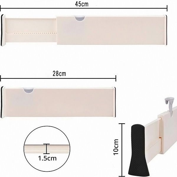 Of het nu gaat om keukengerei, badkamerartikelen of sokken in de slaapkamer – deze verdelers zijn verstelbaar van 28 cm tot 45 cm en passen in de meeste lades. Je kunt je ruimte precies naar wens indelen.