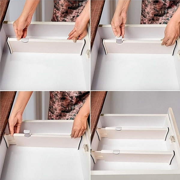 Je transformeert je rommelige lades in enkele seconden. Met een eenvoudige “verplaats en klik”-installatie is organiseren nog nooit zo eenvoudig geweest. Plaats, verstel en vergrendel de scheidingswand gewoon op zijn plaats – geen gereedschap of lijm nodig.