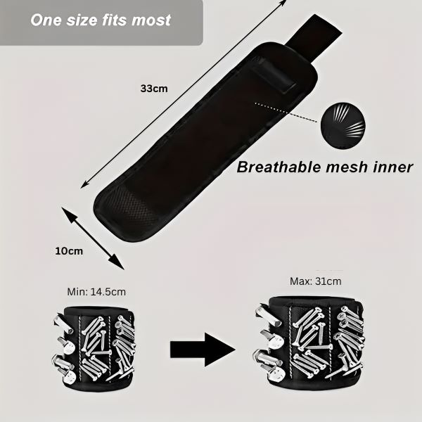 De krachtige magneten in deze armband wikkelen zich gemakkelijk om je pols en houden kleine metalen voorwerpen zoals schroeven, spijkers en bouten binnen handbereik.