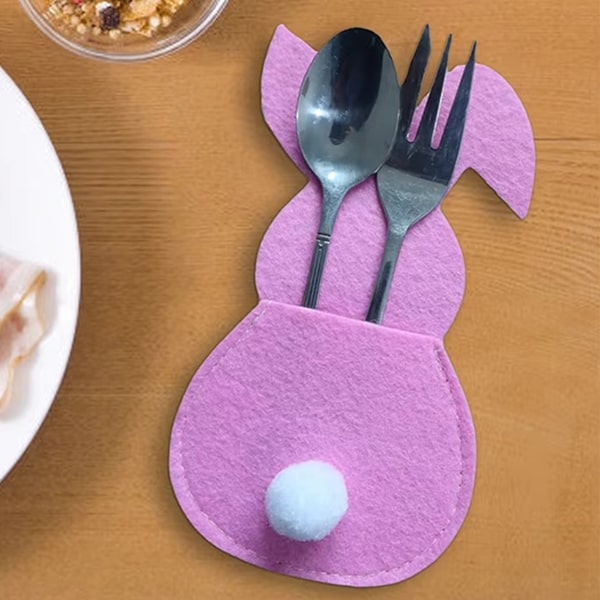 🐰 Søde kanin-bestikholdere. 🌸 Glade farver: blå, lyserød, gul og lilla. 💪 Holdbare og robuste. 📏 Perfekt pasform til knive, gafler og skeer (15×8,5 cm). 🎁 Sæt med 4 – den perfekte borddekoration!