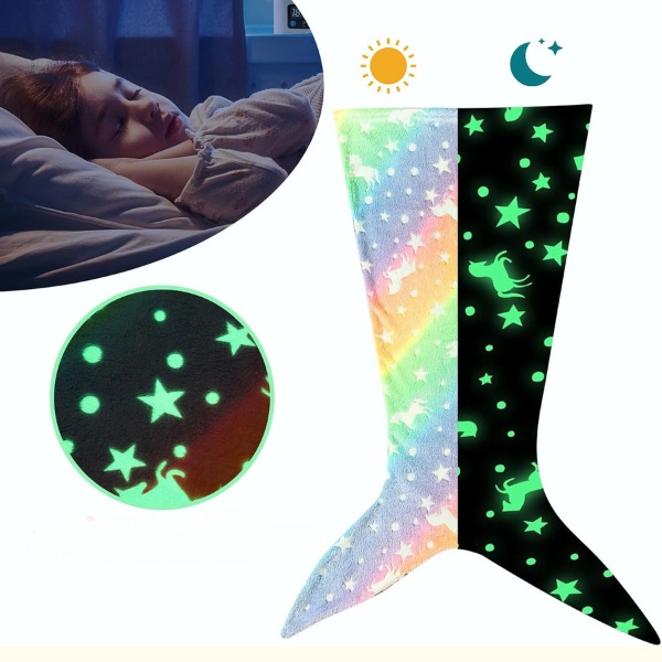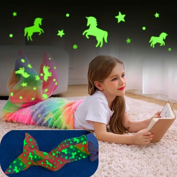 MERMAIDREAM-tæppet lyser i mørke og giver et beroligende skær, der hjælper med at fjerne frygt for mørket. Læg det blot i dagslys i 20 minutter, og det vil lyse hele natten. Vælg mellem hajhale- eller havfruehale-design for en ekstra magisk stemning, når dit barn skal sove.