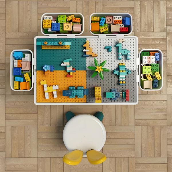Bordet kan bruges på begge sider – den ene side er til byggeklodser, mens den anden har en glat overflade.